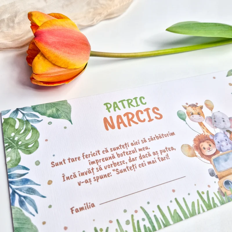 Un detaliu remarcabil este plicul roz, cu greutatea cartonului de 120 g/m2 care opțional poate fi sigilat cu ceară sau sigilat cu un sigiliu tip bandă din hârtie vellum, tipărit cu numele bebelușului, care oferă un aspect deosebit de elegant. Această combinație unică între design și accesorii subliniază atenția la detalii și creează o invitație care va impresiona cu siguranță.