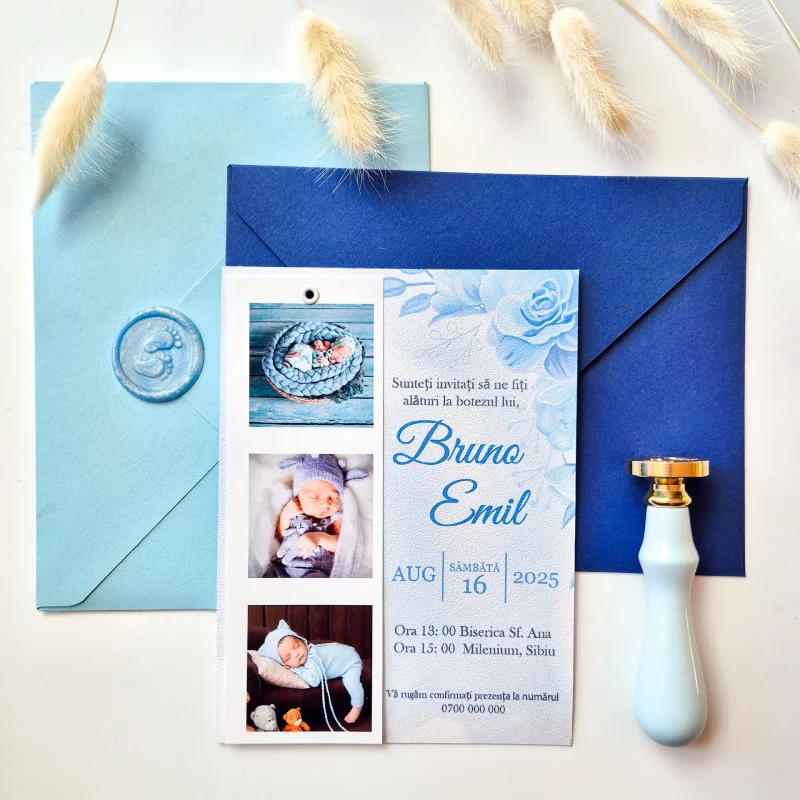 Plicurile elegante, cu o greutate a cartonului de 120 g/m2 oferă o notă distinctivă permițând alegerea între modele precum cel albastru închis sau albastru deschis, la care puteți adăuga opțional un sigiliu din ceară sau un sigiliu tip bandă din hârtie vellum tipărit cu numele bebelușului. Aceste opțiuni sunt perfecte pentru a adăuga un strop de unicitate și sofisticare invitației voastre.