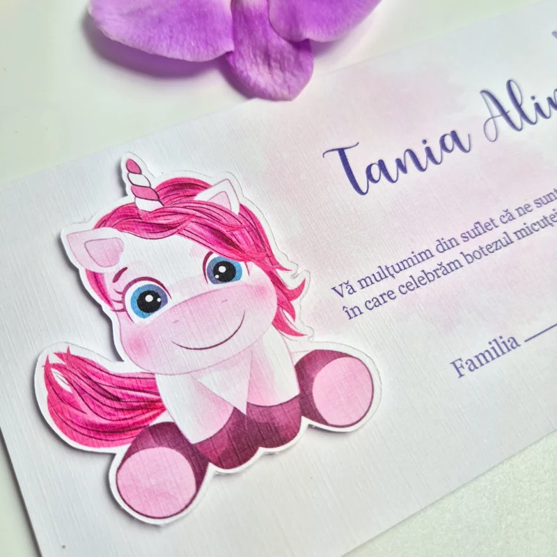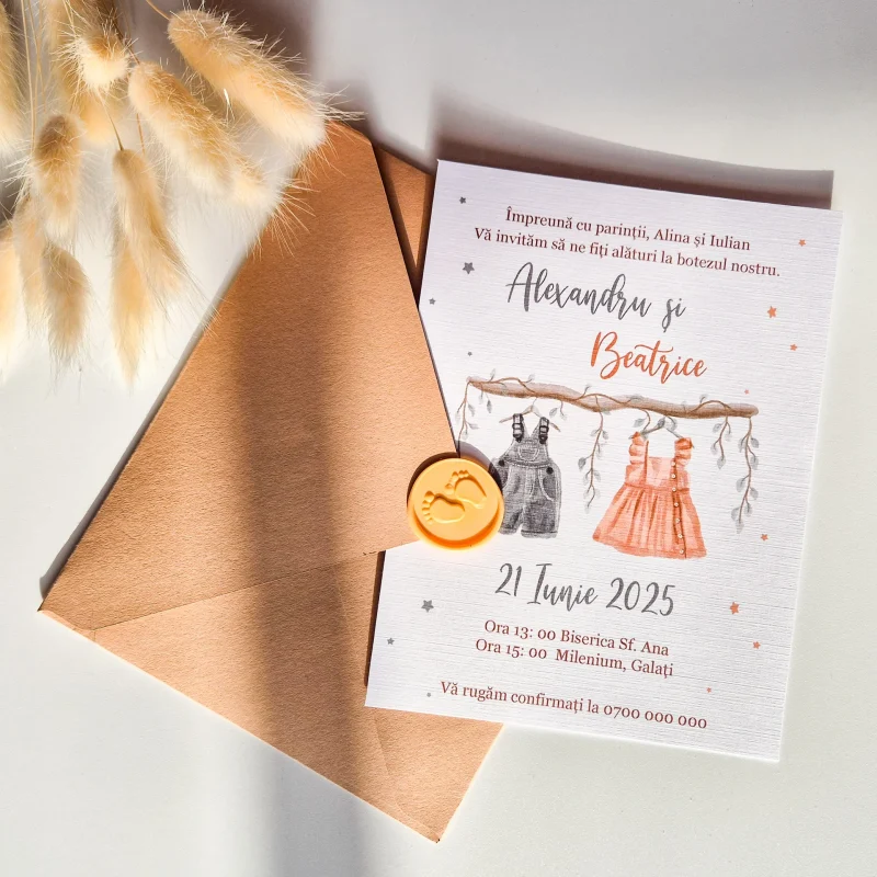 Invitația poate include informații esențiale despre eveniment, precum numele micuțului, locațiile și programul ceremoniei. De asemenea, permite includerea unui mesaj special sau a unui simbol al poveștii voastre de familie.