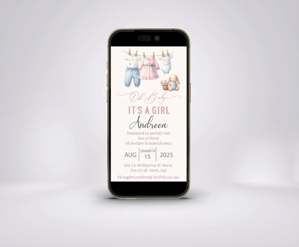 Această invitație se evidențiază prin ilustrațiile dulci cu hăinuțe și jucării suspendate pe o sfoară, completate de fonturi elegante și culori pastelate. Detaliile grafice adaugă o notă plină de viață, în timp ce structura clară asigură o prezentare estetică a informațiilor.