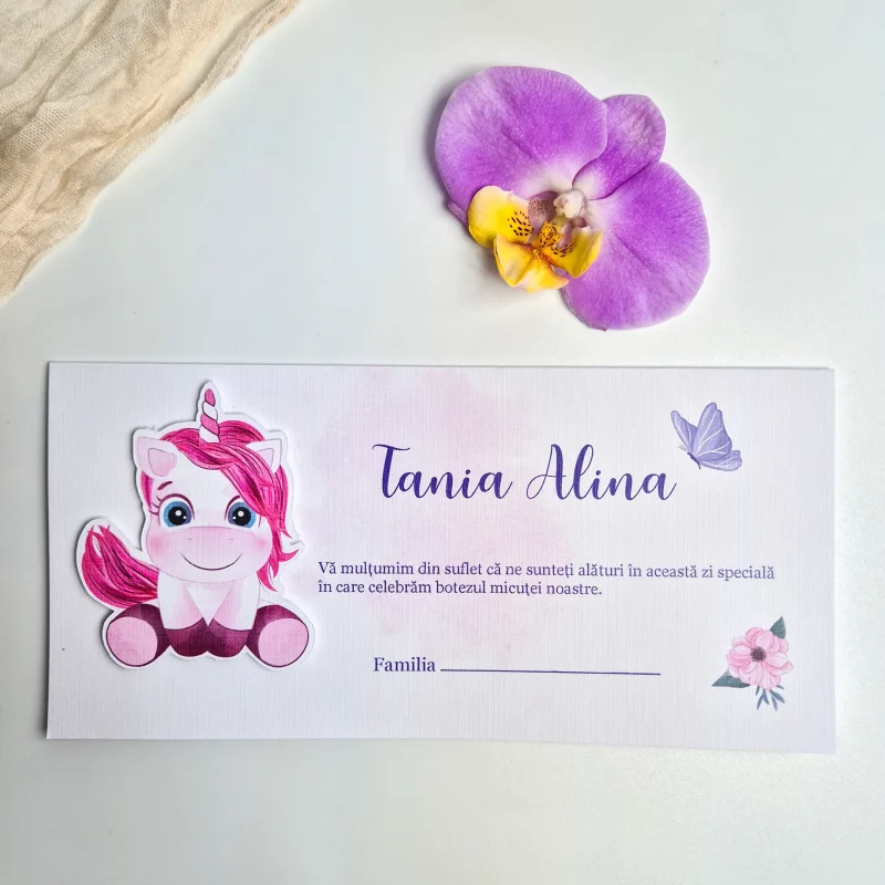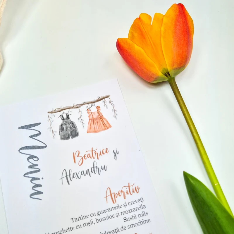 Pentru o organizare impecabilă, invitația poate fi însoțită de accesorii complementare, cum ar fi meniuri, numere de masă sau plicuri pentru bani, toate adaptate tematicii evenimentului.