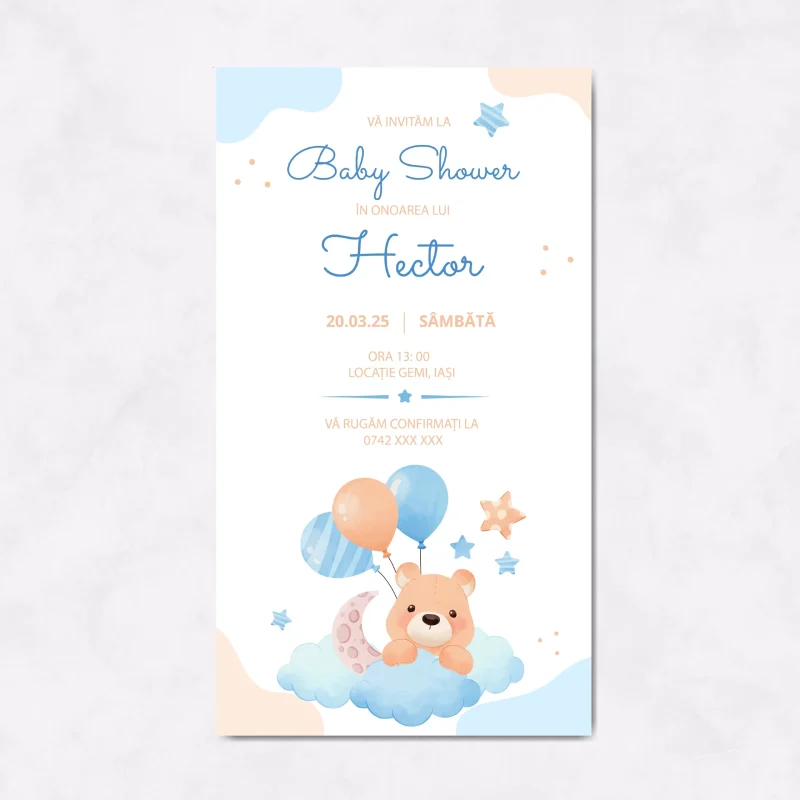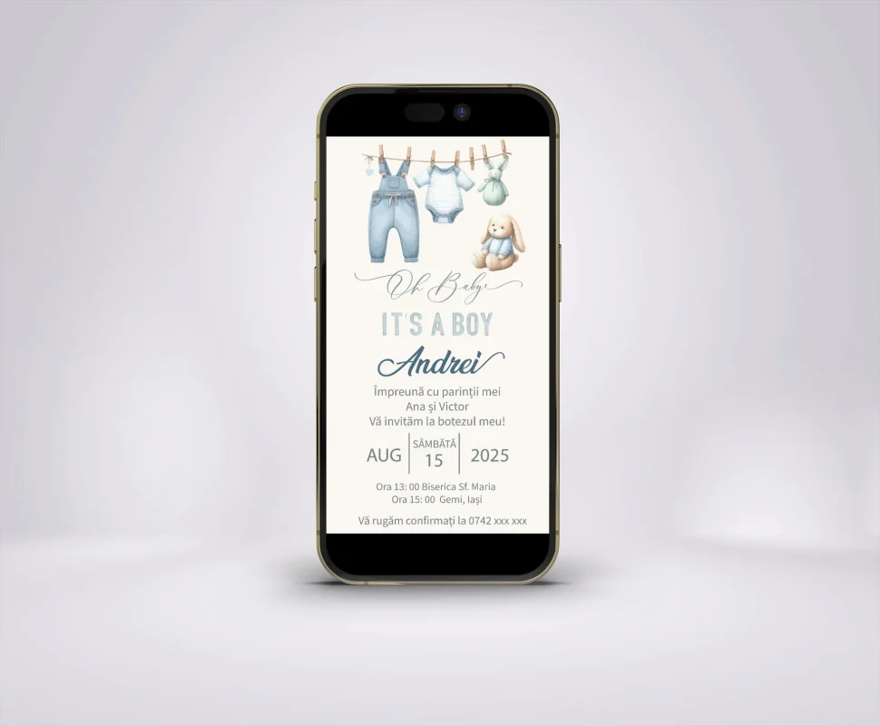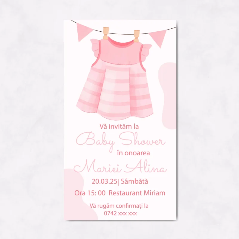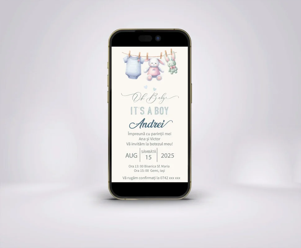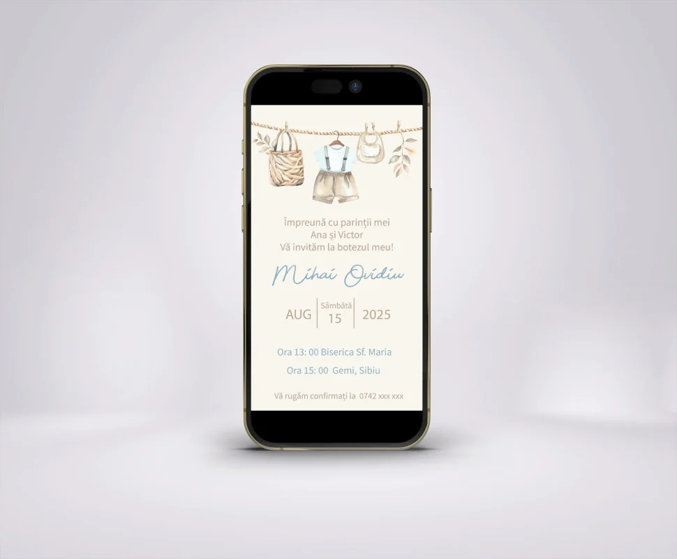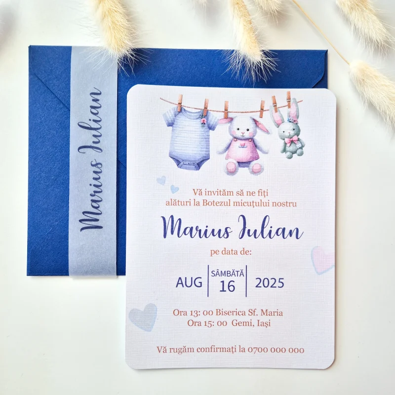 Invitația se remarcă prin ilustrațiile adorabile cu două hăinuțe suspendate pe o ramură decorativă, un detaliu care simbolizează legătura familială și puritatea copilăriei. Aceste elemente, alături de culorile pastel și textul delicat, creează o atmosferă caldă și primitoare.