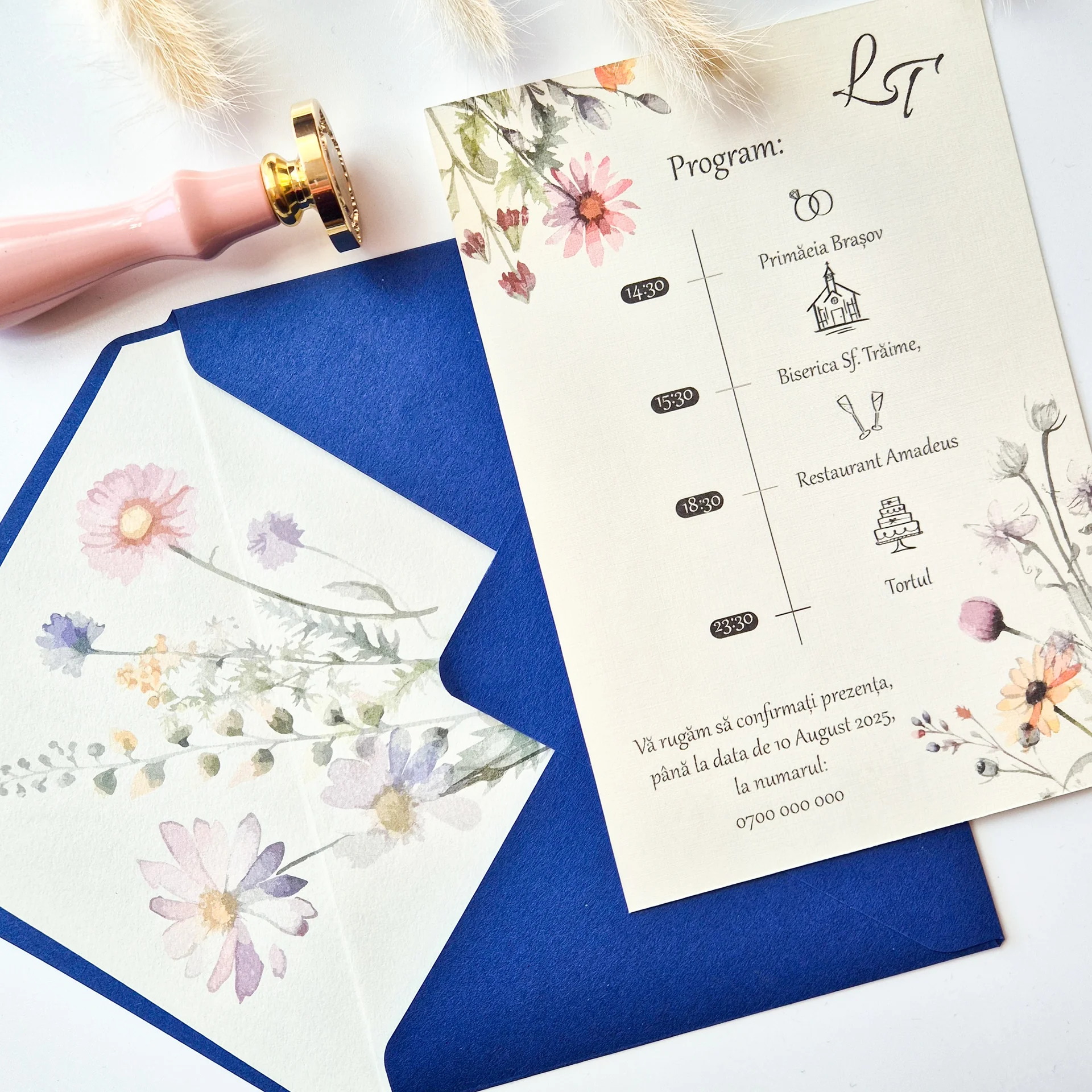 Contrastul dintre albastrul vibrant al plicului și delicatețea designului floral din interior subliniază atenția la detalii și rafinamentul evenimentului. Greutatea cartonului este de 120 g/m2.