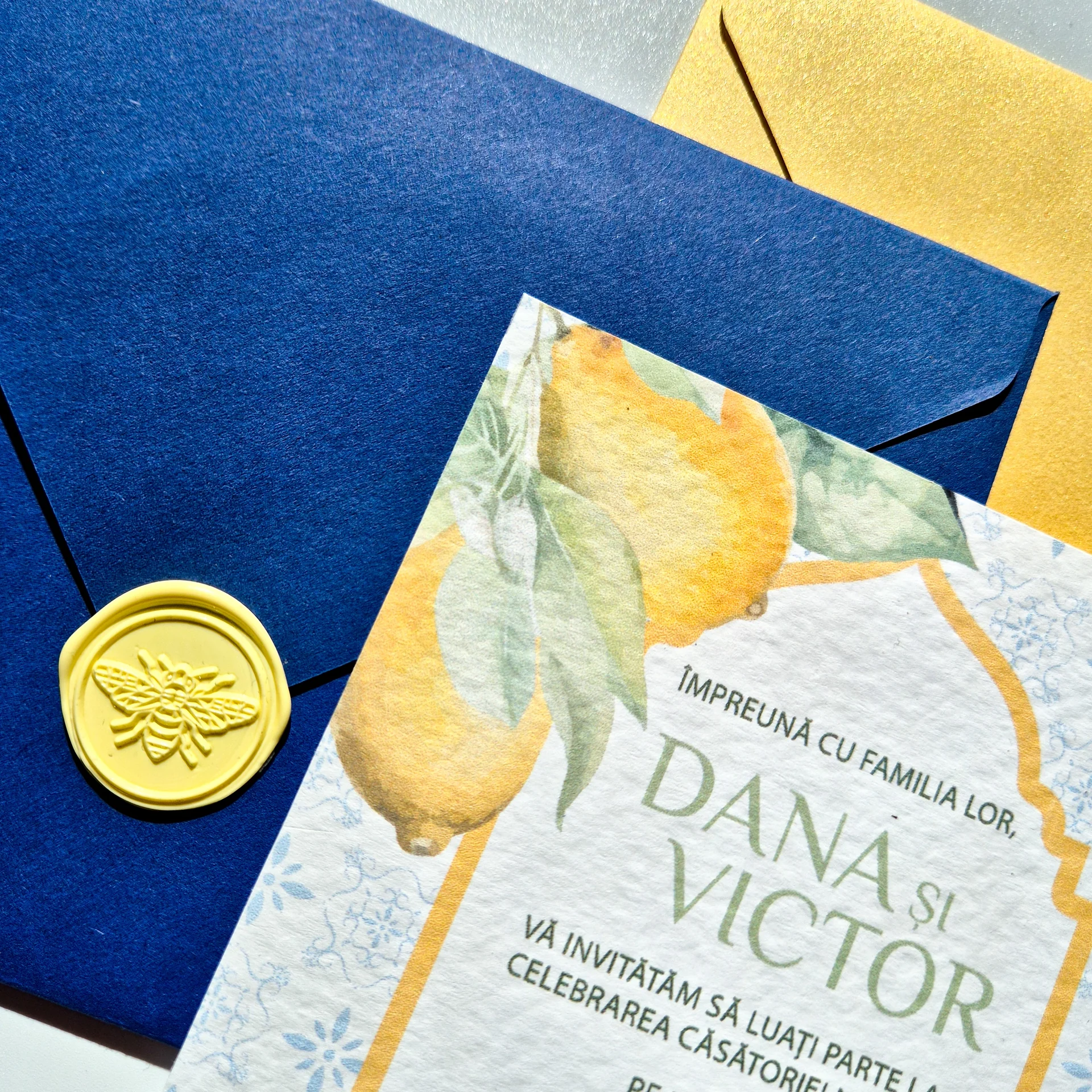 Puteți alege între două plicuri în culori sofisticate, cu greutatea cartonului de 120 g/m2 —albastru și galben sidefat— ce completează perfect atmosfera naturală. Pentru fiecare plic puteți adăuga opțional un sigiliu de ceară decorativă sau un sigiliul bandă vellum, tipărit cu data evenimentului.