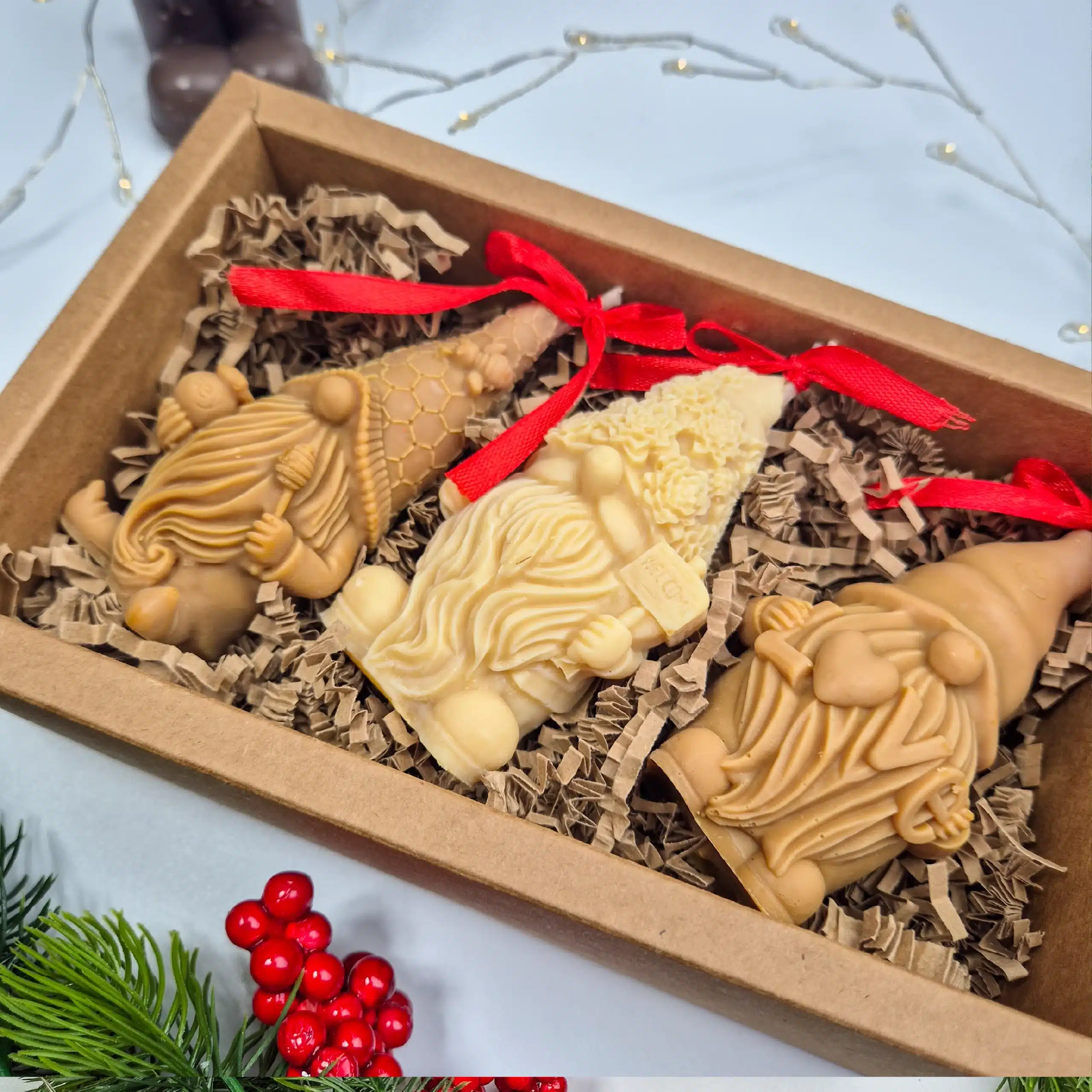 • 🎅 3 lumânări în formă de spiriduși – fiecare cu design unic